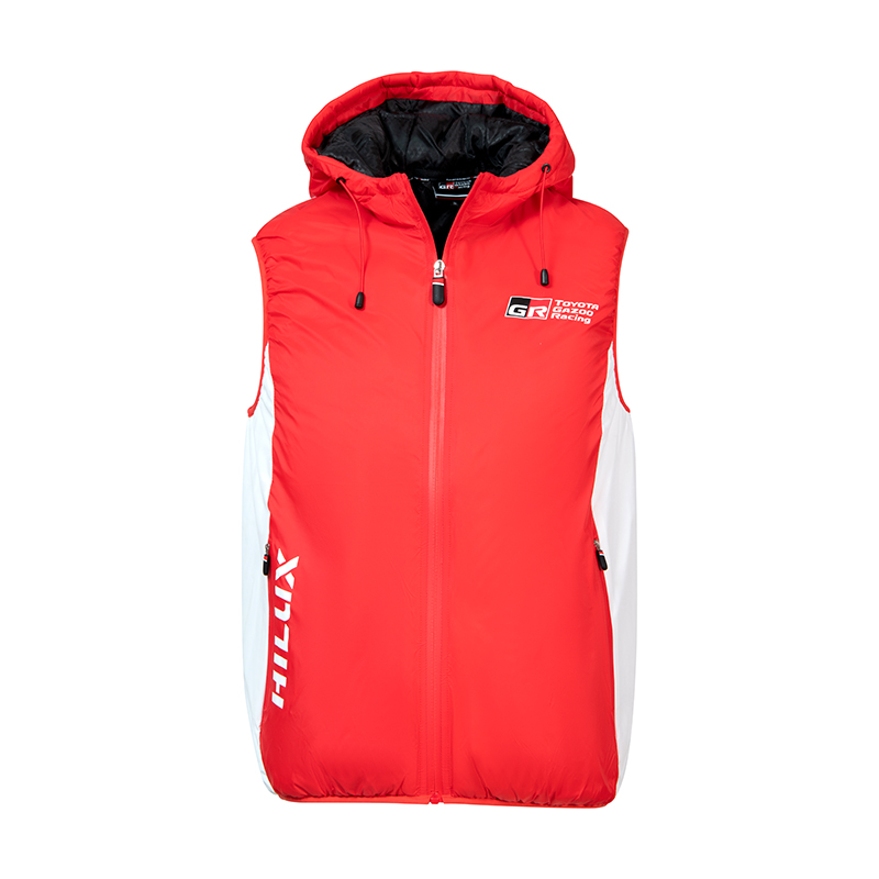 The TOYOTA GAZOO Racing Rally Raid Team Hooded Gilet is a high-quality piece of professional teamwear marked by its superior padding and GR print on the back. The gilet is enhanced with showerproof zips and features a TGR logo inspired lining. It stands out through its distinct zip pulls, interior red slip pocket, bespoke back neck tape, team and sponsor logo, and contrasting white panel details that collectively add to its sophisticated look.
