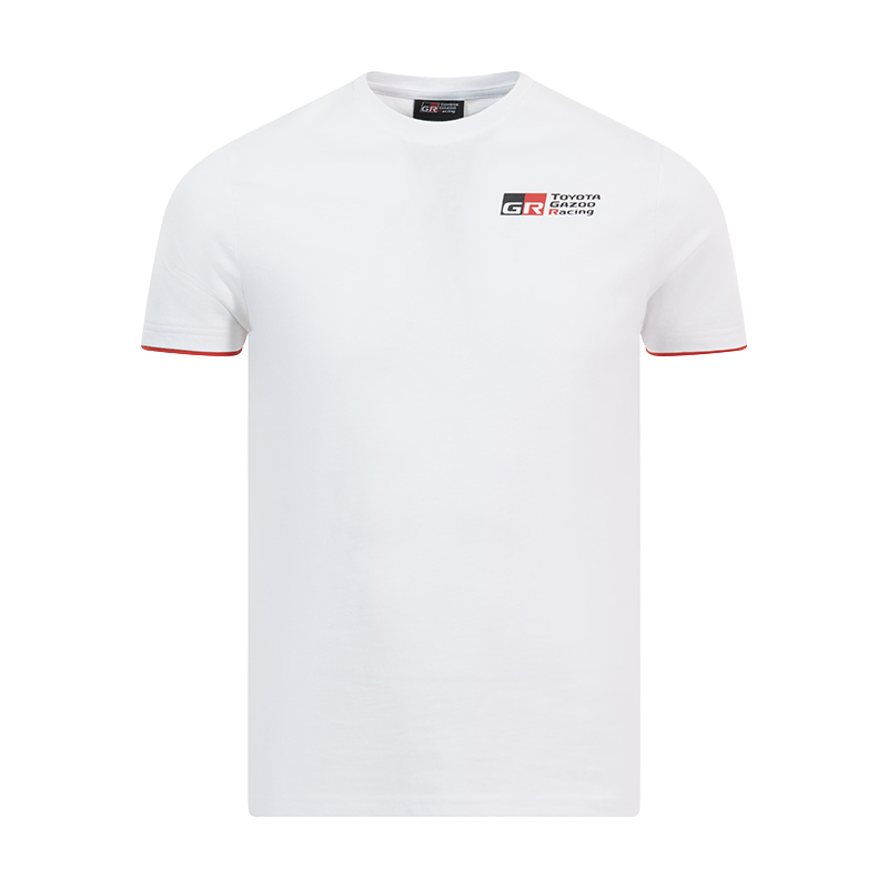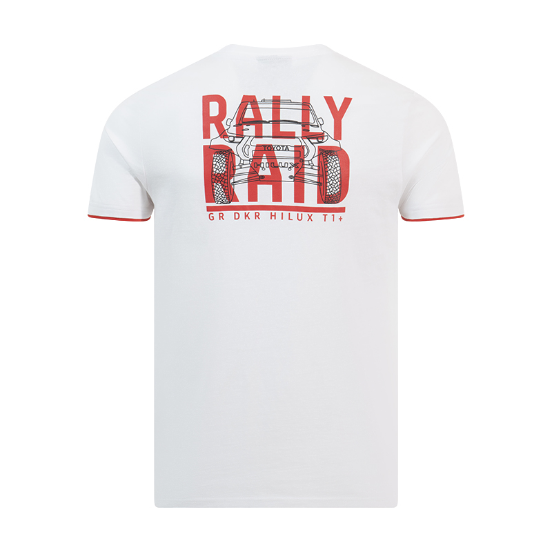 TOYOTA GAZOO Racing Rally Raid supporters t-shirt! Showcasing a stunning GR DKR Hilux Evo T1U print to the front, capturing the excitement of rally racing. The team's logo is elegantly incorporated into the design, finished with double-layer contrasting cuffed sleeves and contrasting block design for a sleek style